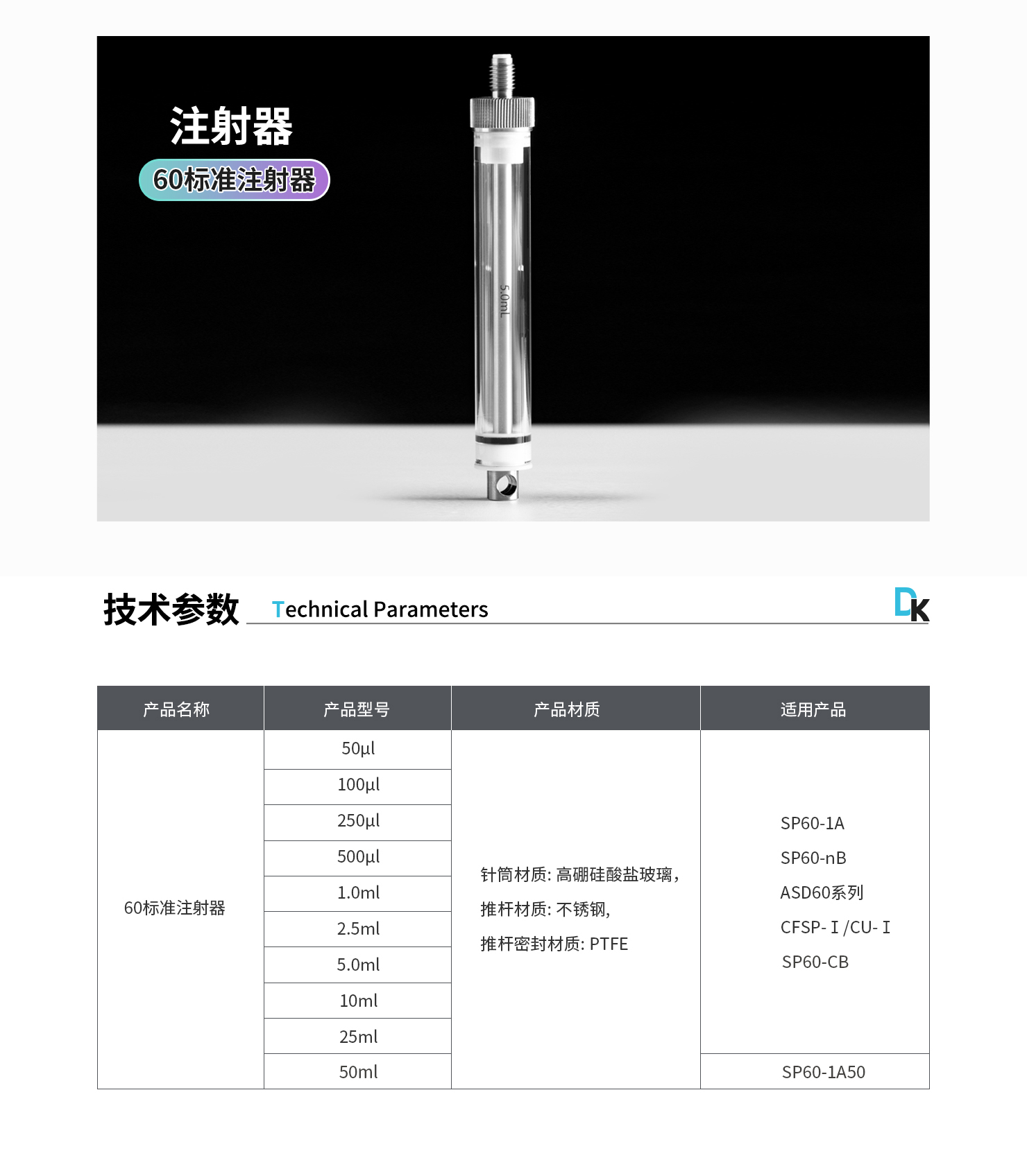 注射器材質:針筒材質: 高硼硅酸鹽玻璃, 推桿材質: 不銹鋼, 推桿密封材質: PTFE